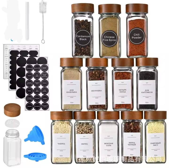 ✨ 12 spice jars, pen, 40 stickers (unwritten), 18 written stickers, funnel, bamboo tray and brush