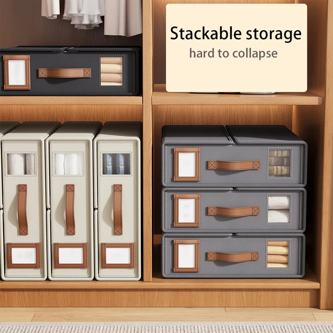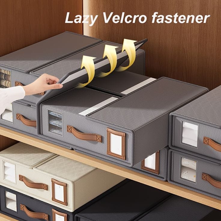 Front Handle: A reinforced leather-like handle on the front makes it easy to pull out the box from shelves or closets.